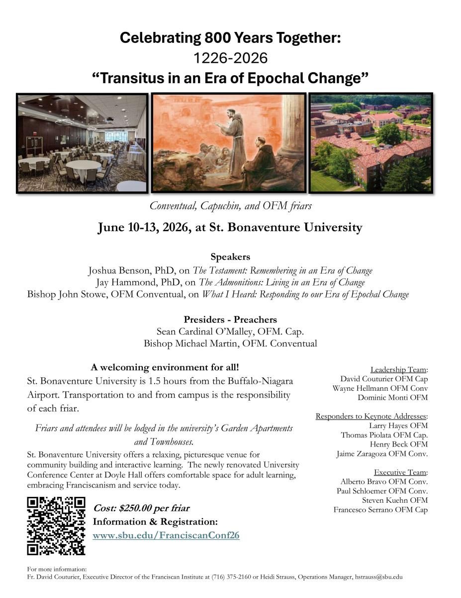 ALL Conventual, Capuchin, and OFM friars: Join together at St. Bonaventure University on June 10-13, 2026, for the celebration of Transitus, 800 years together.